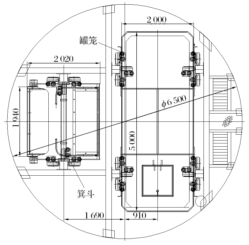 為了便于下放長材及大件,罐籠中盤設計為活動式,取下中盤后的罐內凈高達到 6.1 m;罐籠下盤設有活動配重車,配重車質量為15.175 t。在箕斗正常提運時,配重車開進罐籠下盤充當配重;在罐籠提人時,配重車開出罐籠,同時箕斗不準提礦,箕斗僅作配重用,罐籠每次提升zui多允許乘 80 人/2 層。