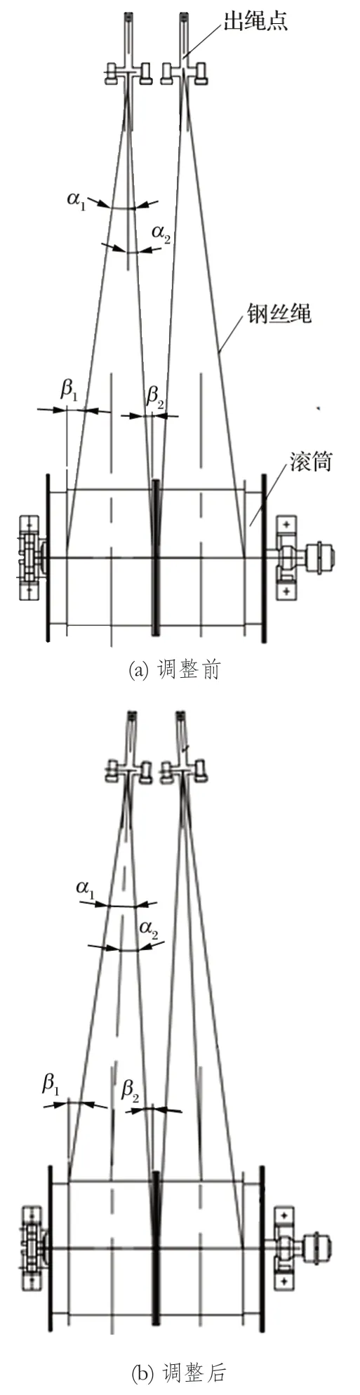 圖4 調整前后鋼絲繩內外偏角對比示意